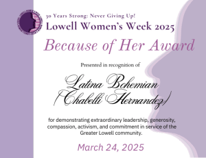 The Because of Her Award honors women whose dedication to Lowell is evident through their courage, generosity, compassion, and activism. This award specifically recognizes those who have not traditionally been acknowledged for their contributions–women who have performed extraordinary acts of service beyond the scope of their paid work, including individuals who: